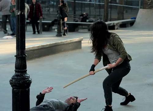 (es decir, pedirle que la ataquen por sorpresa en la calle de manera que si esto fuera una serie de TV parecería que son asaltantes para después en un IMPREVISIBLE GIRO ARGUMENTAL revelarse como sus estudiantes)